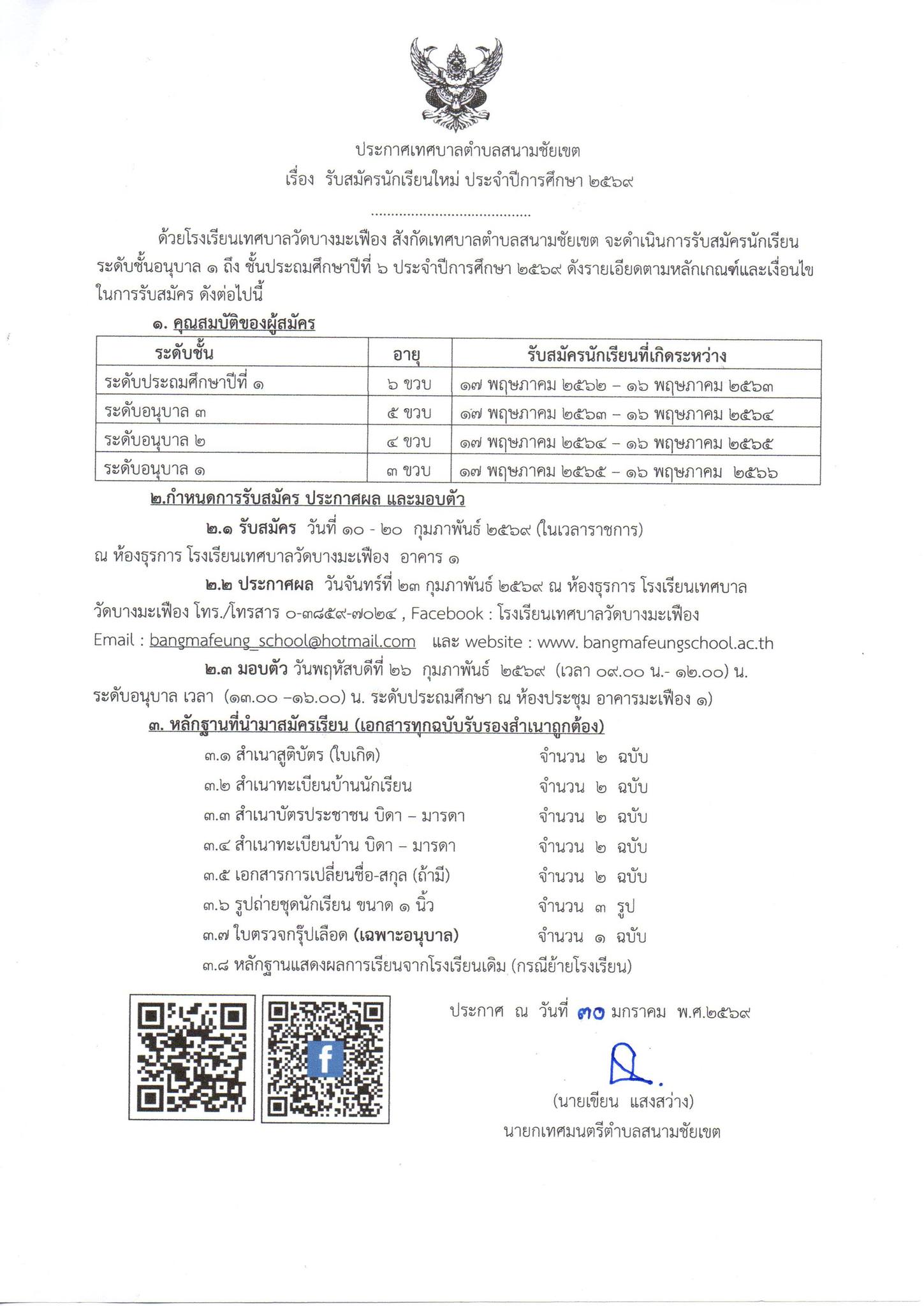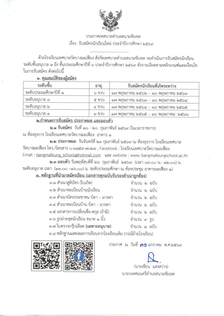 ประชาสัมพันธ์โรงเรียนเทศบาลวัดบางมะเฟือง แจ้งประกาศ เรื่อง รับสมัครนักเรียนใหม่ ประจำปีการศึกษา 2568 ตั้งแต่วันที่ 10 กุมภาพันธ์ 2568 – 24 กุมภาพันธ์ 2568 (ในเวลาราชการ) ณ ห้องอำนวยการ อาคาร 1 โรงเรียนเทศบาลวัดบางมะเฟือง รายละเอียด ดังที่แนบมาพร้อมนี้![]()